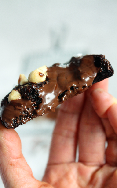 a dark choc fudge brookie ( think–> brownie meets cookie which is possibly one of , if not , THE most delicious fusions to ever exist) soft baked, super fudgy, decadent, rich chocolate cookie that’s chewy on the inside with jussssst the right amount of crispiness on the edges – aka my dream cookie – stuffed with your fave choc hazelnut spread, topped with a layer of espresso infused dark chocolate then finished with a sprinkling of deliciously buttery, roasty, toasty, hazelnuts + a pinch of flakey sea salt!!!!!!!!!!!!!!!!!!!!!!!!!!!!!!!