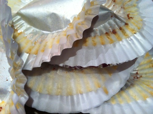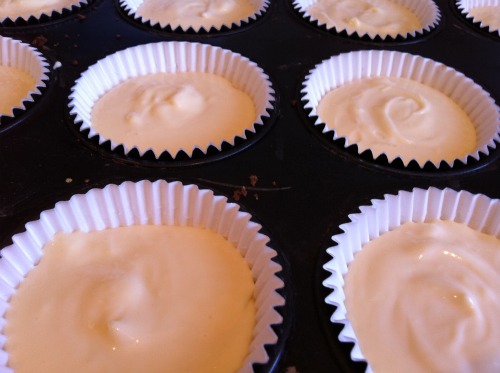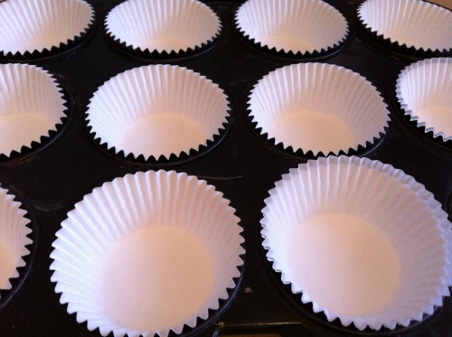 Spoon cookie mix evenly into the paper cases. (I used a Tablespoon and roughly added about 1 1/2 Tablespoons per case)