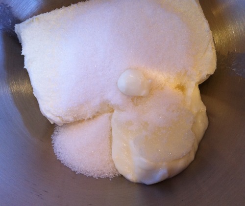 In a large bowl place cream cheese, greek yoghurt and sugar. Blend until smooth and well combined.