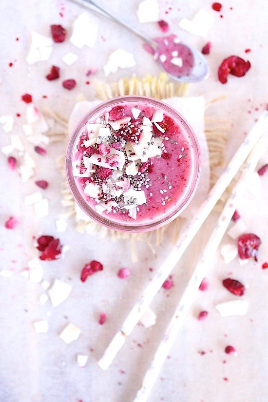 2 – Pour into a chilled glass or mason jar then top with coconut flakes, chia seeds and pomegranate if desired.