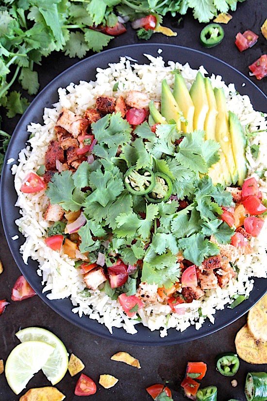 Succulent, juicy, Mexican spiced chicken is pan seared served on a mountain of light a fluffy cilantro-lime cauliflower rice then topped with a light, fresh, tomato salsa, a few slices of avocado, a drizzle of the most amazing, creamy, dreamy, cilantro-lime crema and a few dashes of your fave hot sauce.