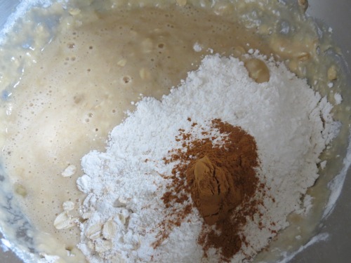 Add flour/oat mix and cinnamon (because you may or may not have forgotten to add it when you sifted the flour mix initially . . .) and mix until just combined.