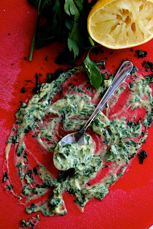 1 – Finely chop your parsley, then either directly to the board or transfer to a plate, add mustard, salt and pepper and squeeze over lemon juice then stir to combine. Set aside