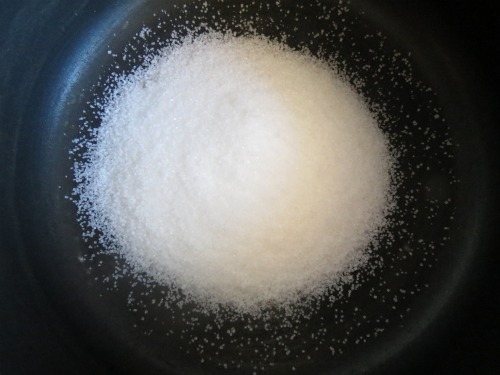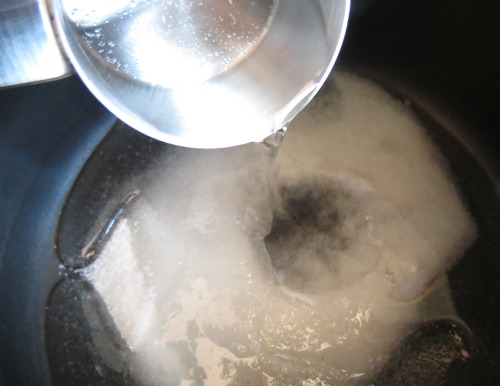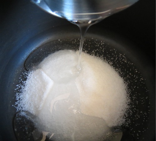 In a medium saucepan pour sugar, then corn syrup, followed by water.