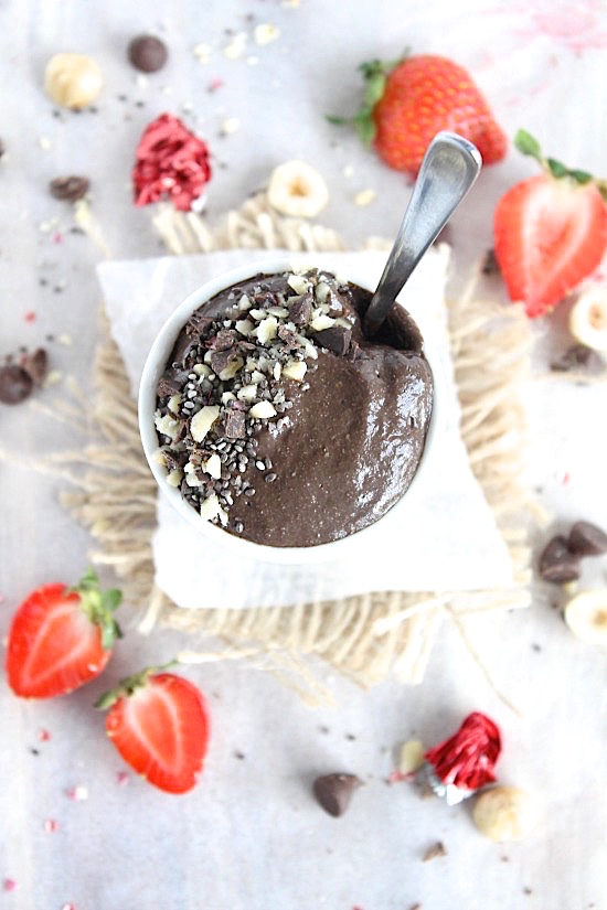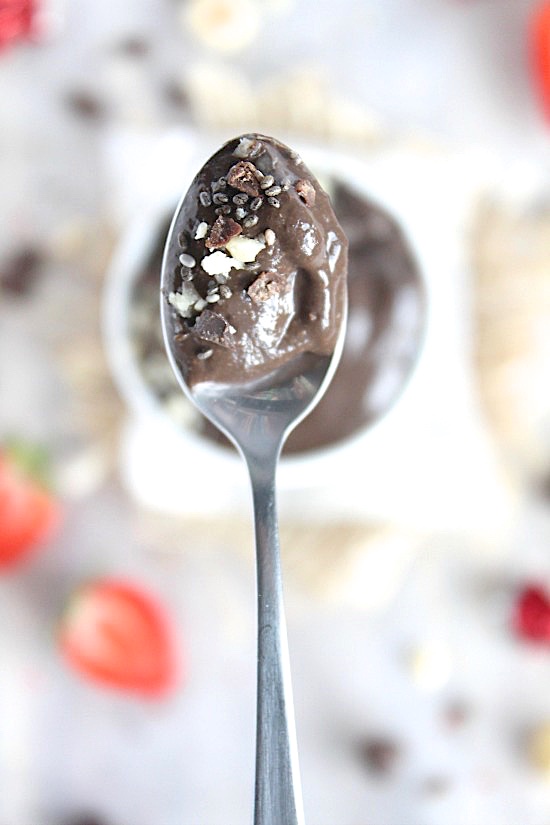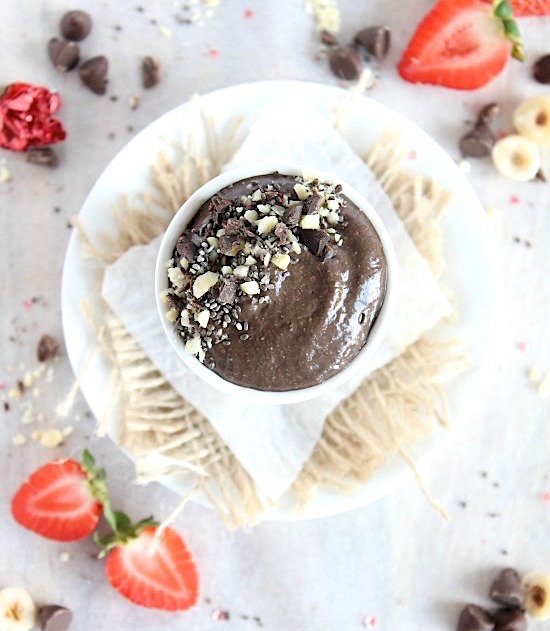 All natural, decadent, rich, thick, creamy, light, fluffy, velvety smooth, subtly sweet, intensely chocolaty chia pudding with a delicate hum of hazelnut;