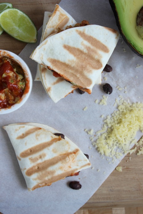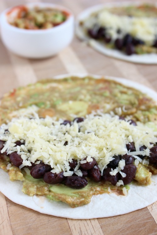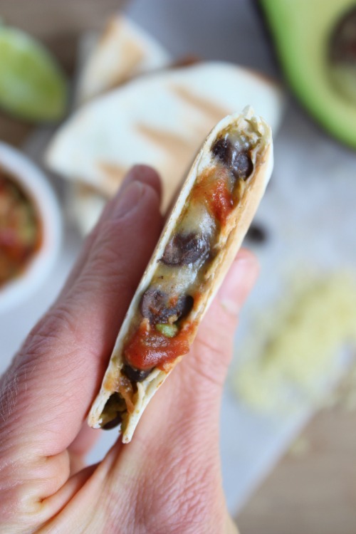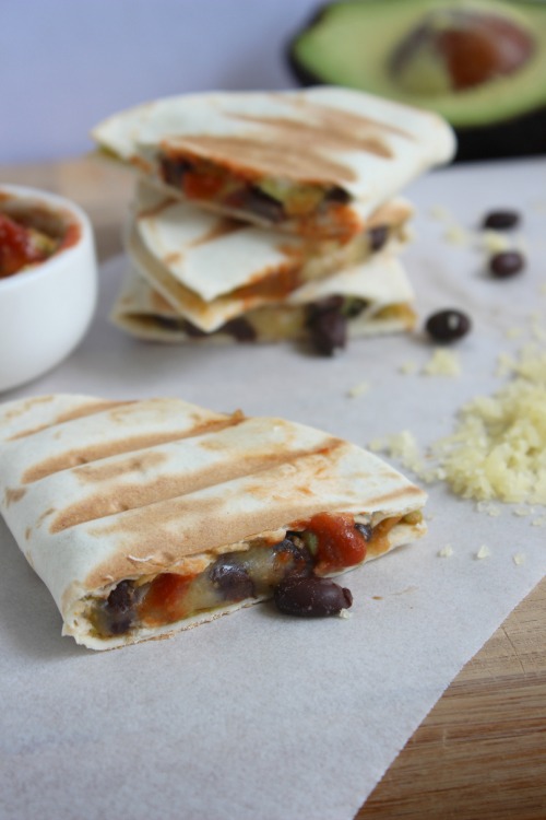 Crispy, crunchy, toasted flour tortillas filled with creamy avocado, a little of your fave zesty, spicy salsa and some meaty little black beans oh and don’t forget the ooey, gooey melted cheese.