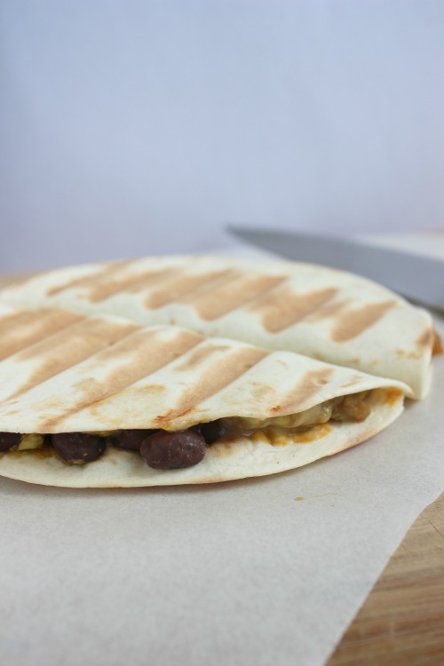 Makes 1 large or 2 small ooegy, gooey, crunchy, crispy, creamy, cheesy, zesty, beany, delicious little quesadillas