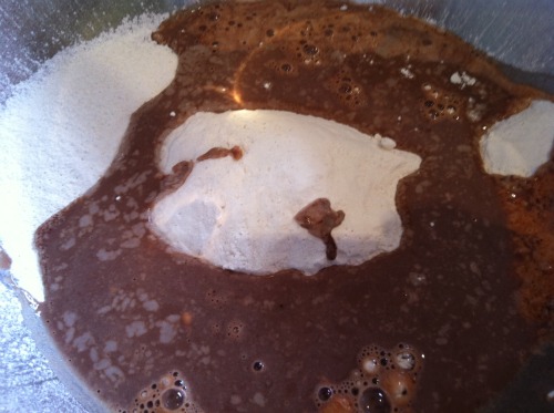 Now pour the chocolate, milk, vanilla mix to the flour, sugar and baking powder mix.