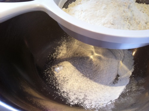 Firstly, get a medium size bowl and sift together 3/4 cup sugar, flour, baking powder, and salt then set it to one side.