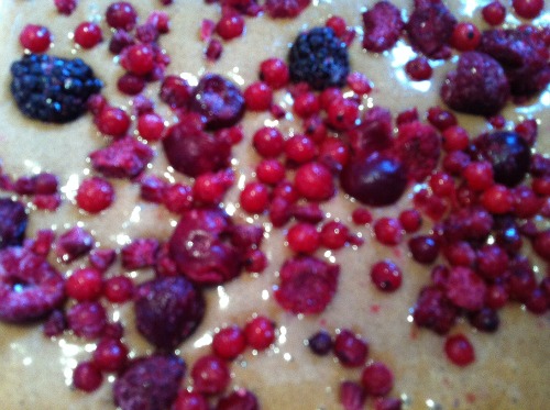 Sprinkle the handful of berries over the cake batter and set it aside. Take note of how pretty it looks…..hold onto this memory, you may need to remind yourself of this desserts inner beauty in the not to distant future…