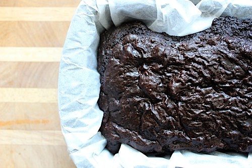 7 – Pour into prepared loaf pan and bake for 35-40 mins, until the top springs back when lightly pressed and a skewer/cake tester has just a few crumbs attached when inserted into the centre.
