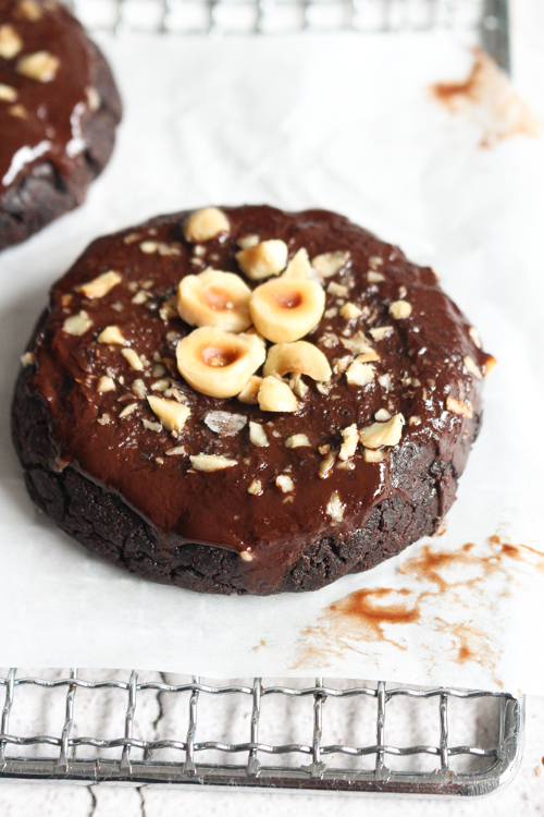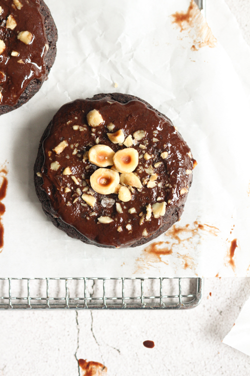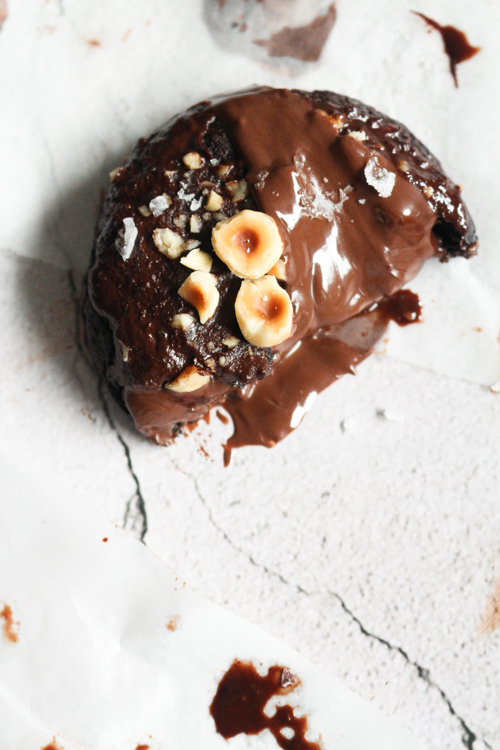 a dark choc fudge brookie ( think–> brownie meets cookie which is possibly one of , if not , THE most delicious fusions to ever exist) soft baked, super fudgy, decadent, rich chocolate cookie that’s chewy on the inside with jussssst the right amount of crispiness on the edges – aka my dream cookie – stuffed with your fave choc hazelnut spread, topped with a layer of espresso infused dark chocolate then finished with a sprinkling of deliciously buttery, roasty, toasty, hazelnuts + a pinch of flakey sea salt!!!!!!!!!!!!!!!!!!!!!!!!!!!!!!!