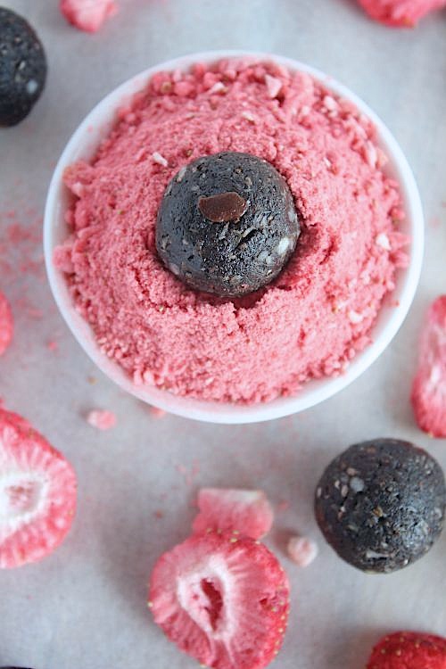 or some coconut which will add an extra, crazy cool, textural element to those soft and chewy, super fudgey bites of deliciousness, or you could crush up some vibrantly delicious, crispy, crunchy, freeze-dried strawberries and coat them in that.