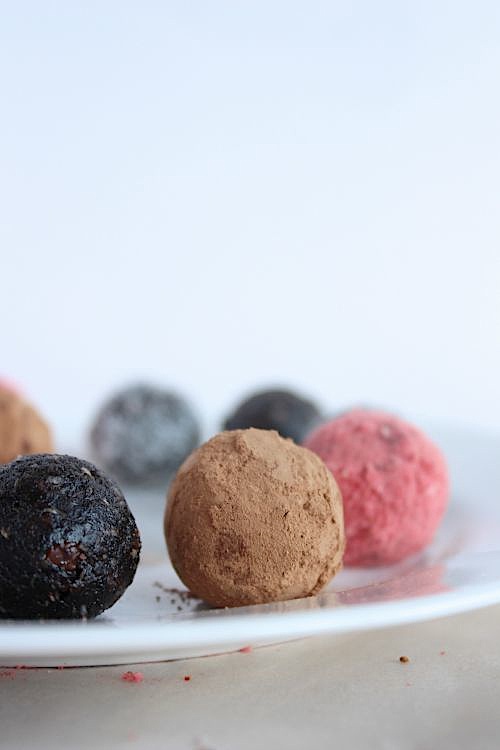 Now, you could serve them simply, straight up, just as they are or, if you’re really wanting to procrastinate, I mean have some fun you could toss those delicious, nutritious, strawberry infused bliss bites in a little cacao,