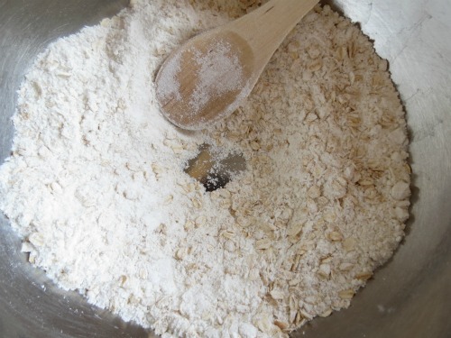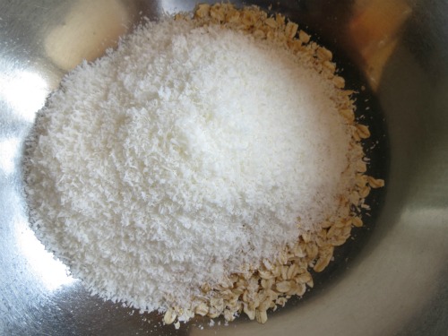 In a medium bowl place oats, coconut, flour then sugar and stir to combine leaving a well in the centre. Set aside.