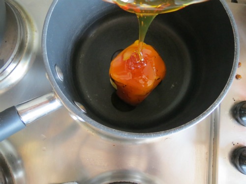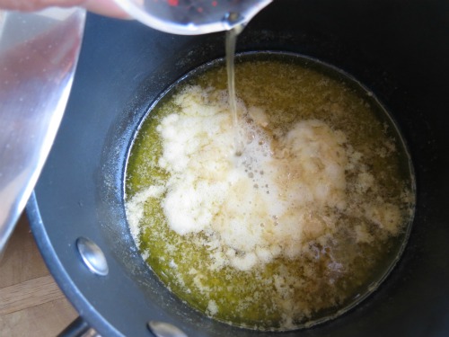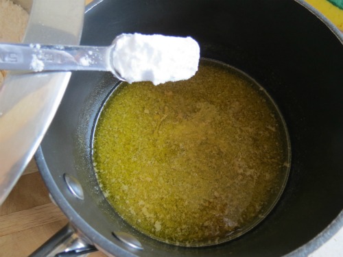 Remove from heat and add baking soda, then boiling water. It will foam up a little, kinda like a weird science experiment. Don’t panic, its supposed to 🙂