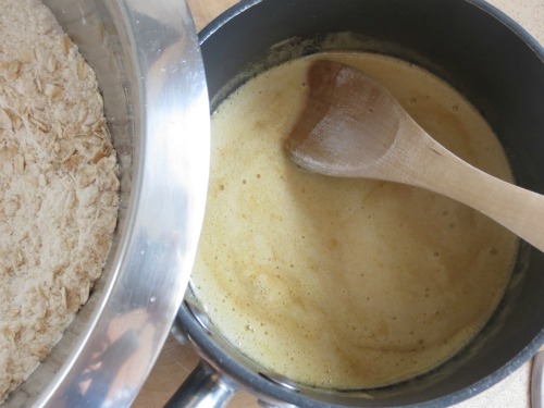 Pour foamy, buttery, golden syrup mix into oat mix