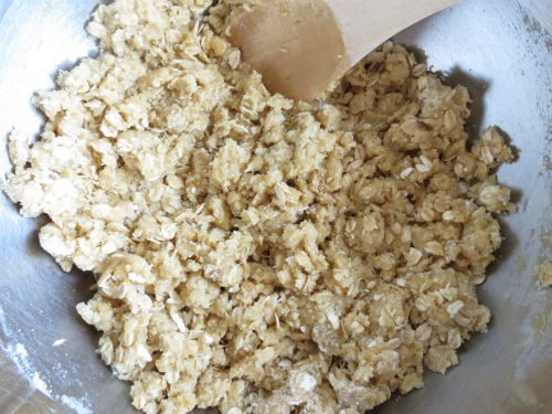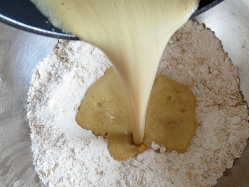Pour foamy, buttery, golden syrup mix into oat mix and stir to combine.