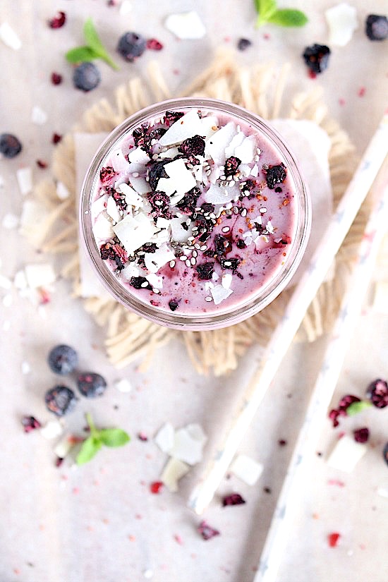 2 – Pour into a chilled glass or mason jar then top with coconut flakes, freeze dried blueberry crumbles, chia seeds and fresh mint if desired.