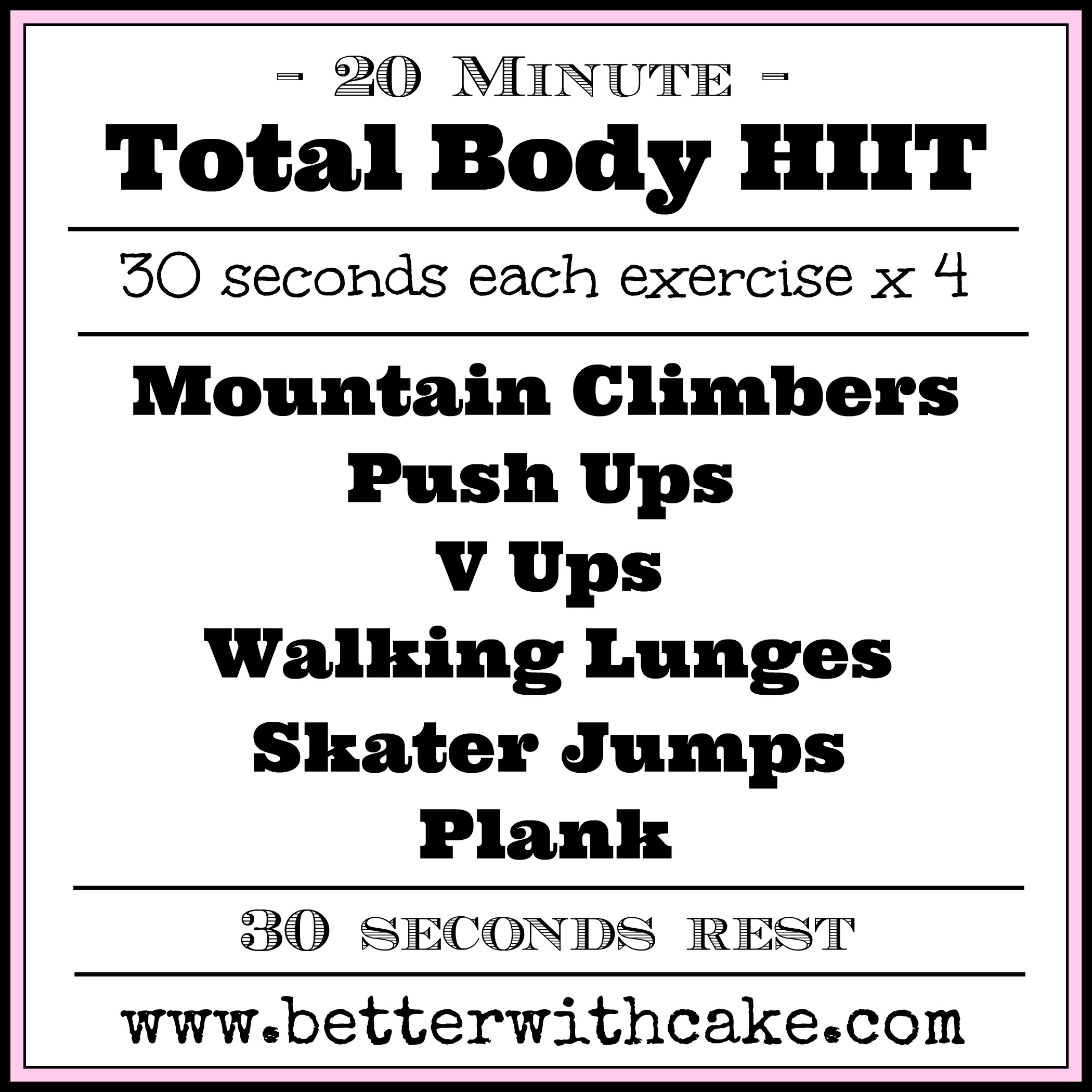 We will do each exercise for 30 seconds before moving on to the next then we will take a 30 seconds to rest before we repeat the entire sequence through for a total of 4 rounds, or as many rounds a pretty in 20 minutes.