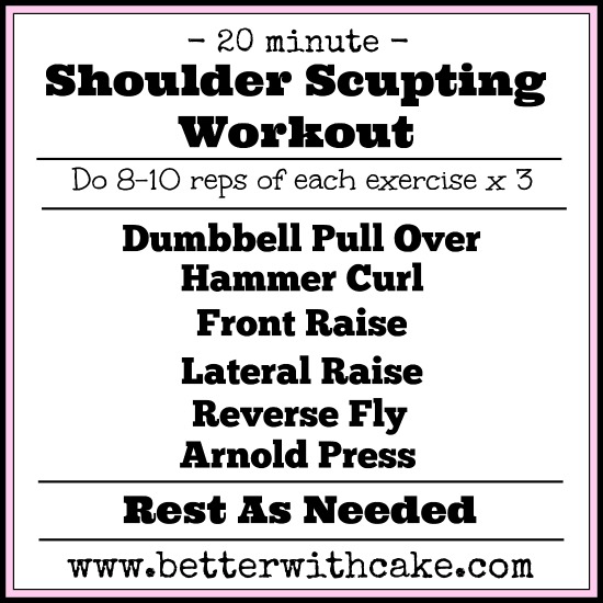 Nothing overly complicated, basic movements done with good form for a short but effective shoulder sculpting workout.