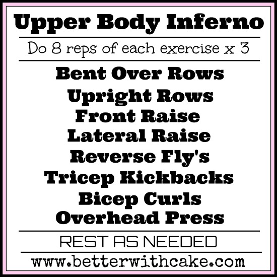 I should warn you though, just because you’re workout is short doesn’t mean it’s not effective, believe me when I say by the final round you will be feeling a nice little fire burning in those beautiful biceps (hence the name – “inferno” ) and um . . . FYI –