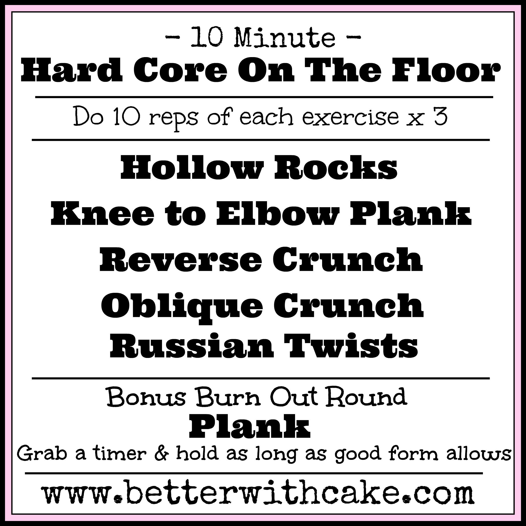 Hollow Rocks – Knee to Elbow Plank – Reverse Crunch – Oblique Crunch and Russian Twists – we will do 10 reps of each exercise (count reps per side for knee to elbow plank – oblique crunches and Russian twists) and repeat the entire sequence through for a total of 3 rounds.