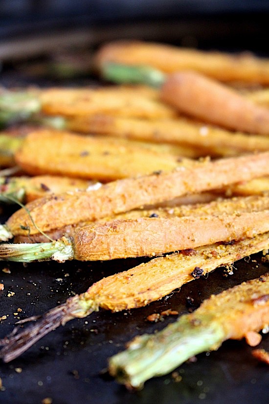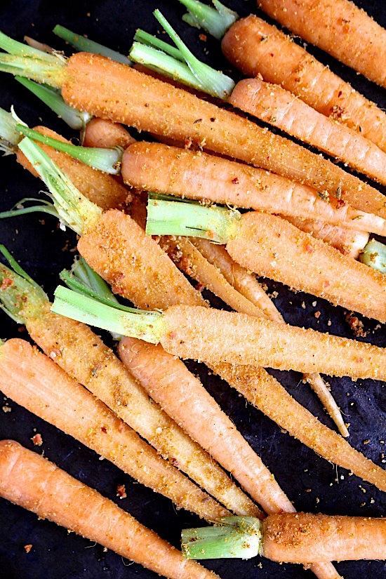 4 – Place your carrots onto your prepared baking sheet, make sure your carrots areΒ evenly spaced on your baking sheet, you want to make sure they have some room to breathe, this is important, it ensures our carrots get nice crispy (not sad and soggy) edges!!!