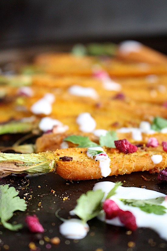 Sweet, tender baby carrots are tossed in an earthy, aromatic Moroccan spice mix then oven roasted until crisp, crunchy and caramelized to perfection before being drizzled with a light, fresh, creamy, dreamy, deliciously nutty, slightly spicy tahini and lime dressing then sprinkled with pretty little pomegranate arils!!!!!