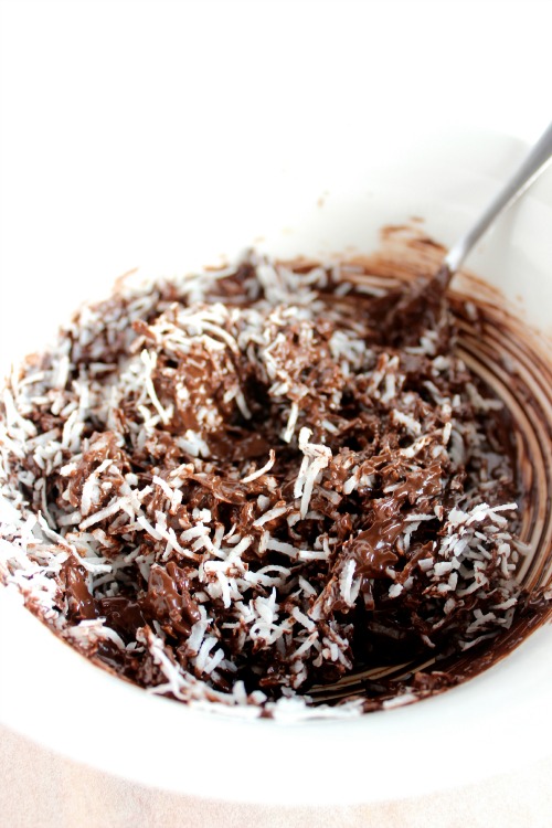 - Once your chocolate is all dreamy and melted, stir through your shredded coconut until well combined.