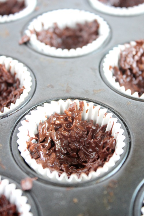 - Spoon approx 1 heaping teaspoon of your chocolate/coconut mix into each mini muffin case and use a teaspoon to gently push a little dent into the centre of each nest then gently spread a little of the mixture up and around the sides of each muffin case. Repeat until all the mixture has been used then pop the tray ingot he fridge or freezer for 10-15 mins until set.