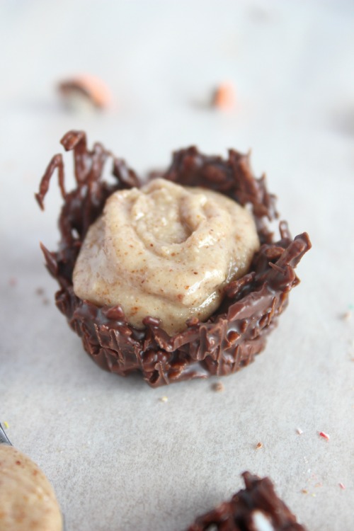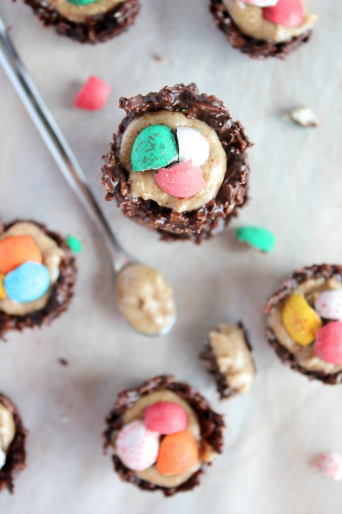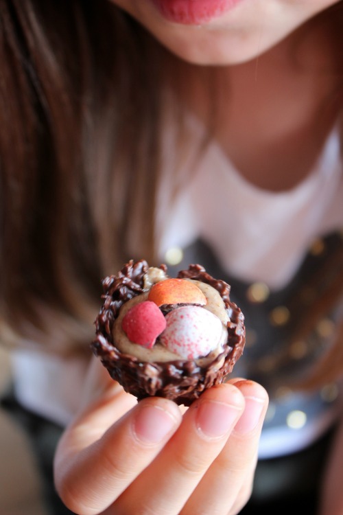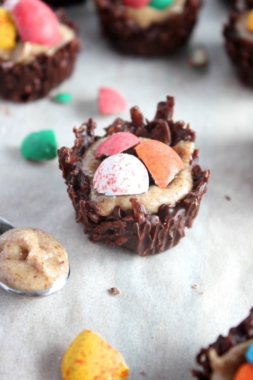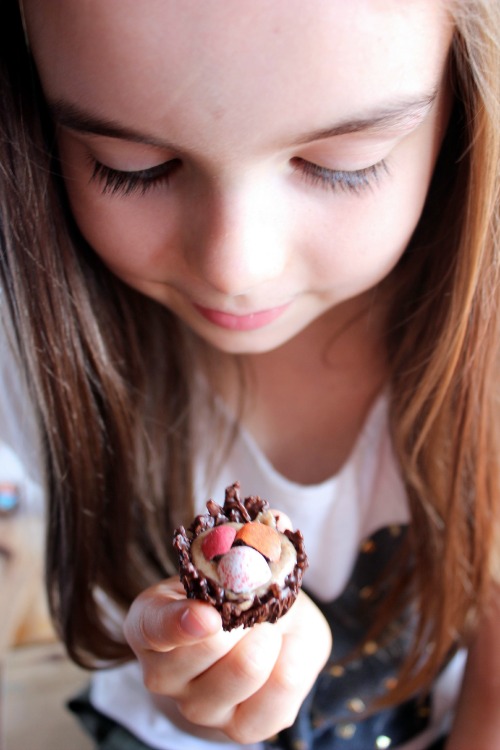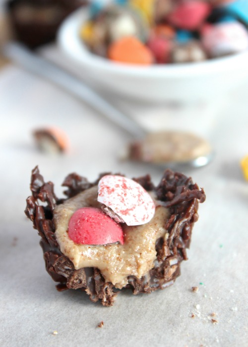- Fill each nest with a teaspoon of almond (or nut butter of choice) then top with (or crumbling over) one of your sweet little easter eggs if using.