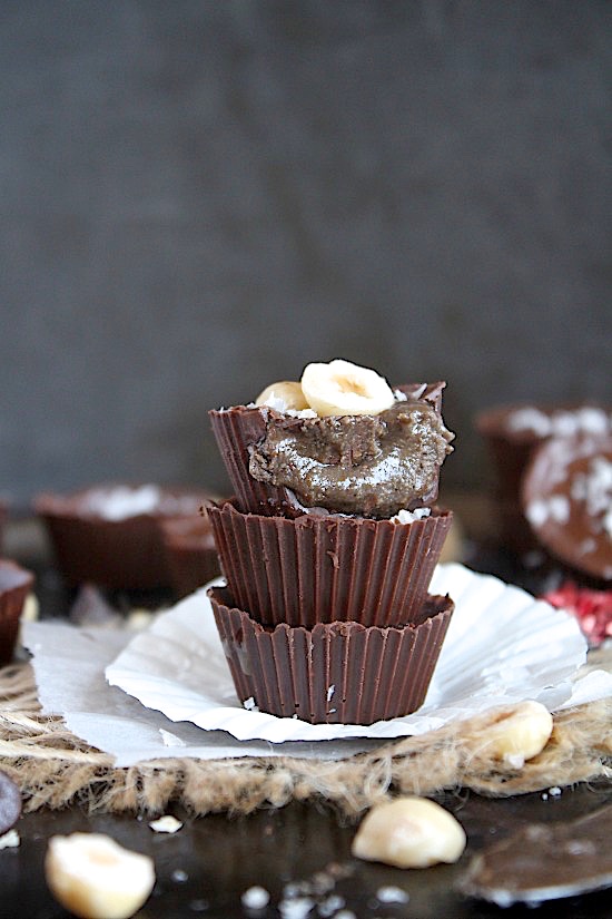 All natural, quick and easy, deliciously simple, seriously indulgent, decadent and rich, cool crisp, salted dark chocolate cups, stuffed with creamy, dreamy, healthy, homemade, chocolate hazelnut almond butter.