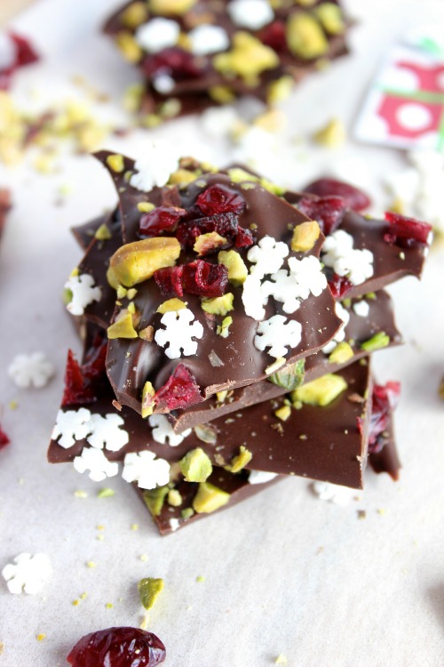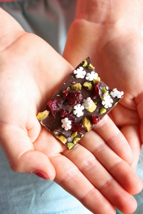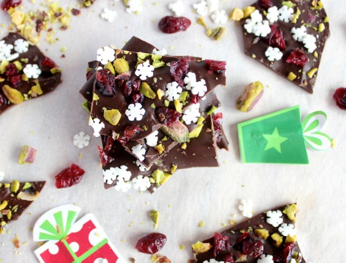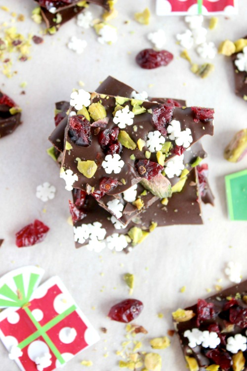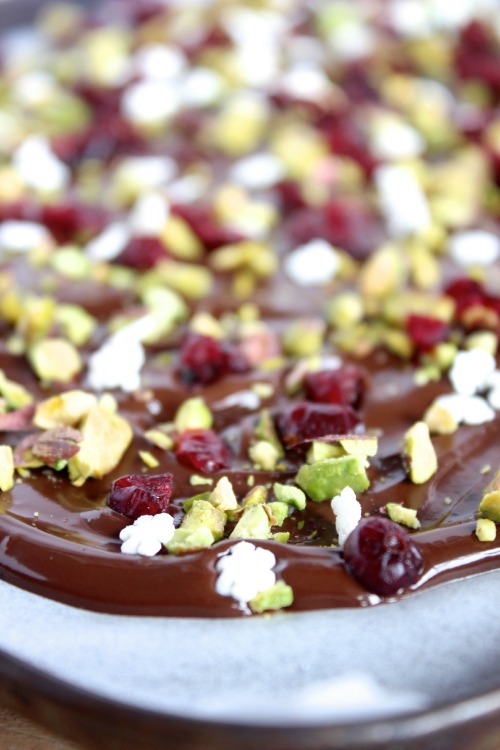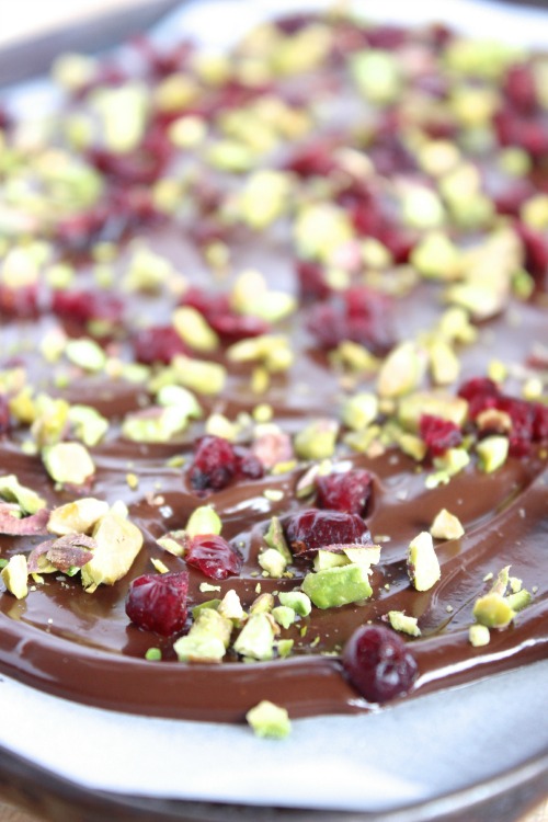Decadent, rich and deliciously smooth dark chocolate is melted down and spread into one cool, crisp, wafer thin layer then sprinkled with some chopped dried cranberries and pistachios (along with some festive looking sprinkles) before being cut (or broken) into delicious little shards.