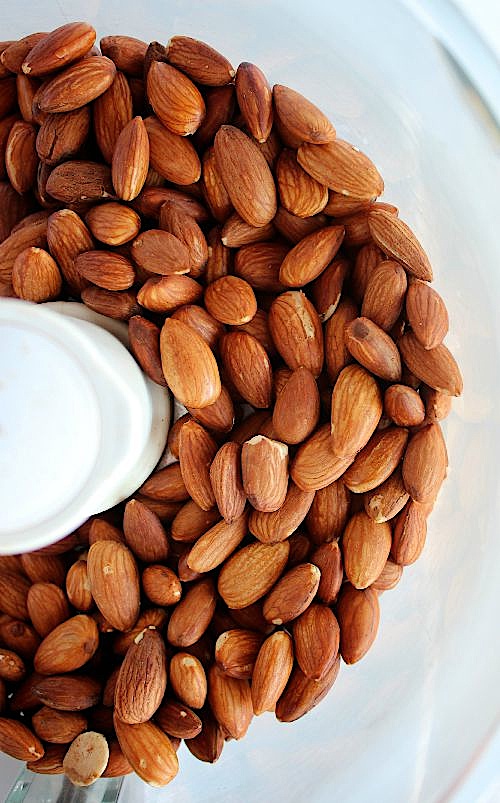 4 – Pour your roasted almonds into the bowl of your food processor or blender, add salt and process until smooth and creamy (or your desired consistency). Initially the almonds would grind down into a powder, give it a minute or two and the oils will extract and it will become deliciously, thick, rich and creamy. You may need to stop and scrap down the sides of the bowl occasionally.