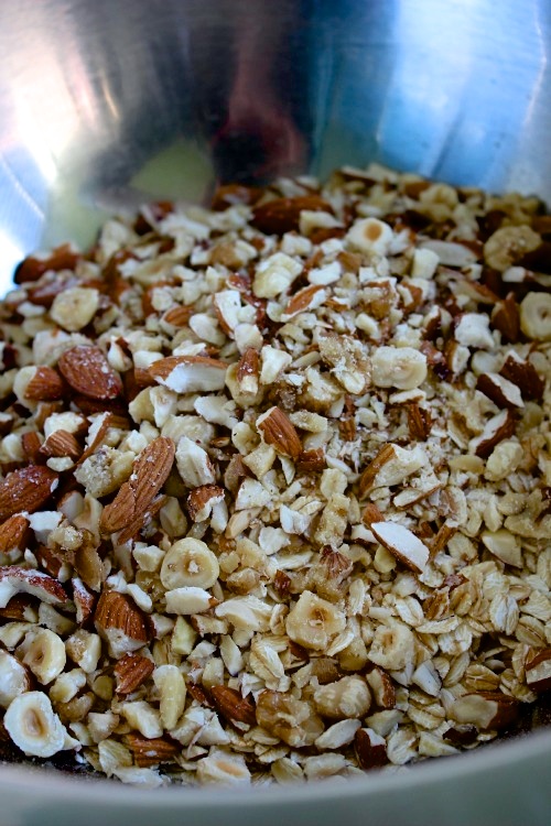 3 – In a large bowl combine oats, chopped nuts, cinnamon, salt and maple syrup and stir to combine.
