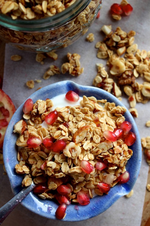 This granola is slightly sweet, super crunchy, cinnamon spiked, maple crusted, nut filled pure goodness.