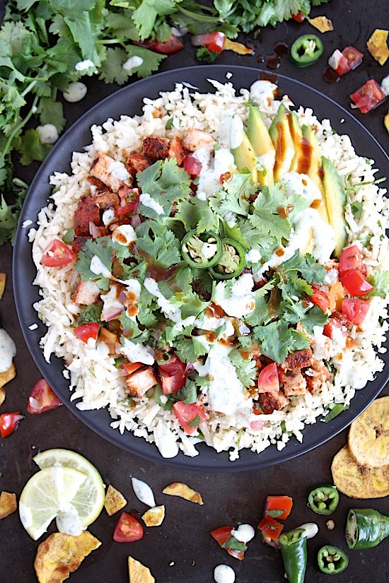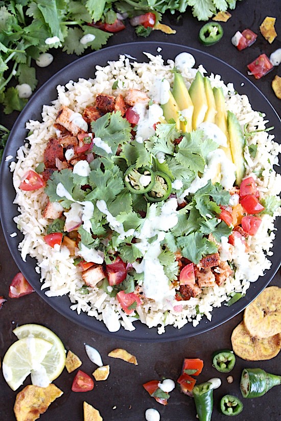 Divide cauli-rice between two serving dishes, add chicken, avocado, pico + a generous drizzle of our dreamy, cilantro lime cream, a little extra cilantro (coriander), some sliced jalapenos’, a few dashes of your fave hot sauce and crumble over your plantain (or tortilla) chips if desired.