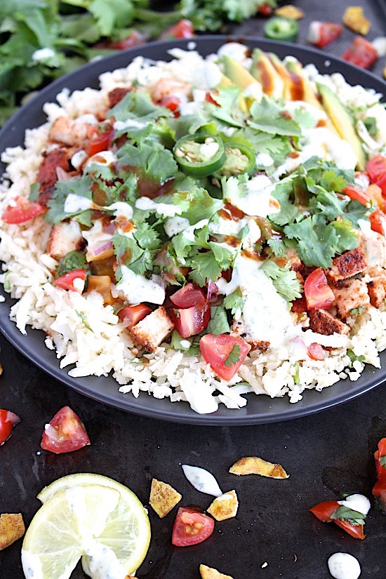Succulent, juicy, Mexican spiced chicken is pan seared served on a mountain of light a fluffy cilantro-lime cauliflower rice then topped with a light, fresh, tomato salsa, a few slices of avocado, a drizzle of the most amazing, creamy, dreamy, cilantro-lime crema and a few dashes of your fave hot sauce.