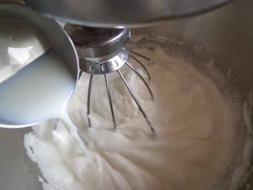 Then add vanilla seeds to your egg whites, followed by the vanilla extract and whisk to combine. Gradually pour in 1/4 cup of the buttermilk and whisk until just combined. Set aside.