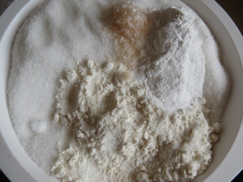 Sift the dry ingredients together into a medium bowl and whisk on low speed very briefly, just to combined.