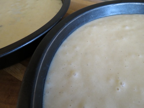 Pour the batter in to your two prepared baking pans as evenly as you can.