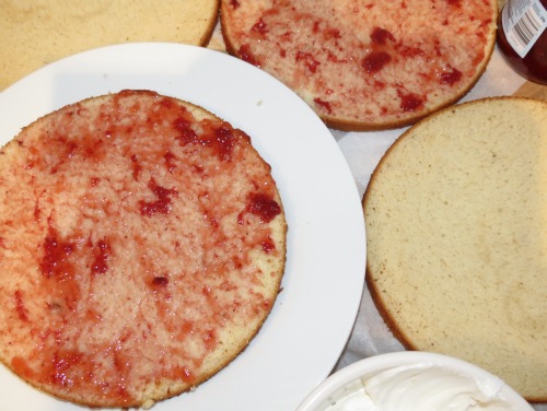 Spread each half with strawberry jam.