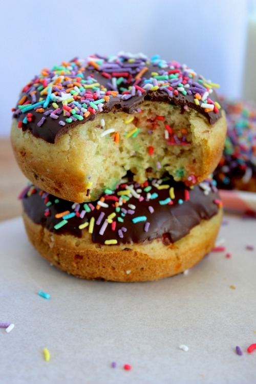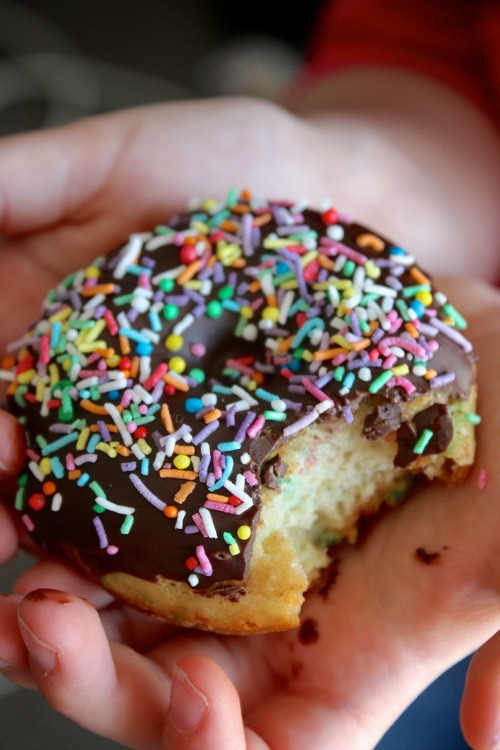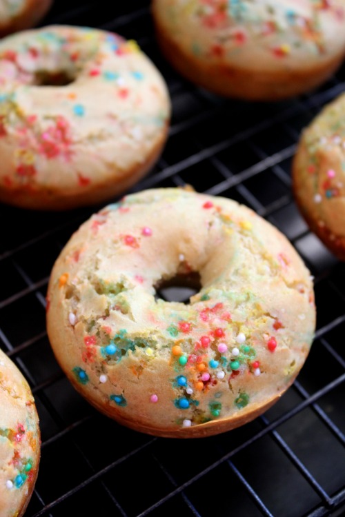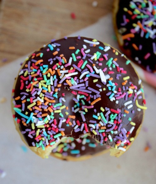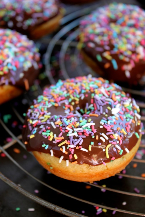 These donuts are light, tender and fluffy, loaded with sweet vanilla flavour and lots and lots of sprinkles. Although you can’t really see the sprinkles, they kinda melted into the donuts while they were baking but we all knew there were there and that’s what matters right?